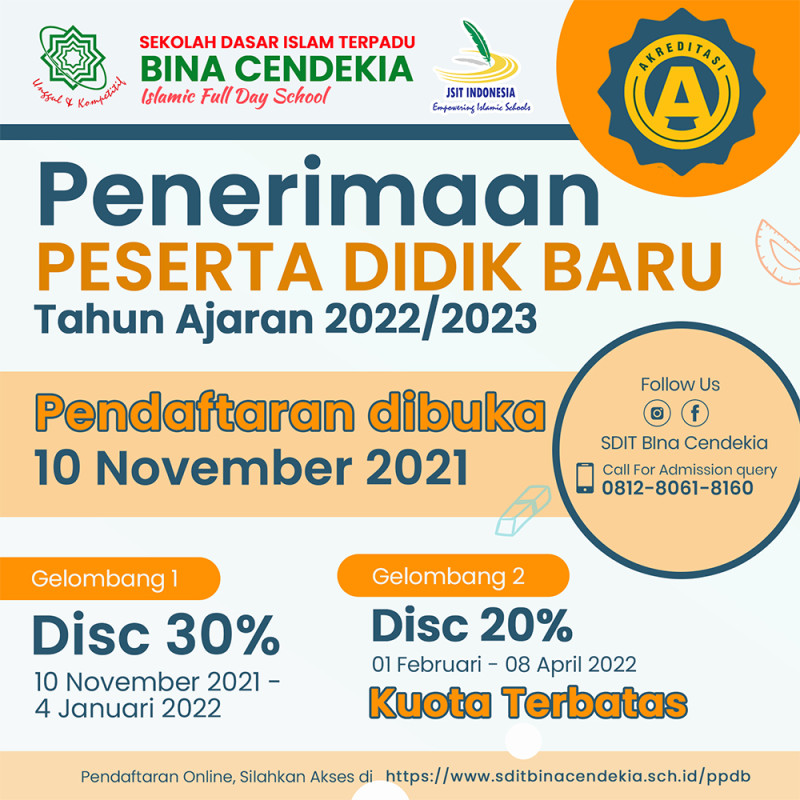 Salam Hormat kami sampaikan semoga ayah dan bunda senantiasa diberikan kesehatan dan limpahan Rahmat Allah SWT, sehubungan dengan di laksanakannya PPDB SDIT BINA CENDEKIA tahun ajaran 2022/2023 ada beberapa informasi yang kami sampaikan kepada ayah dan bunda: