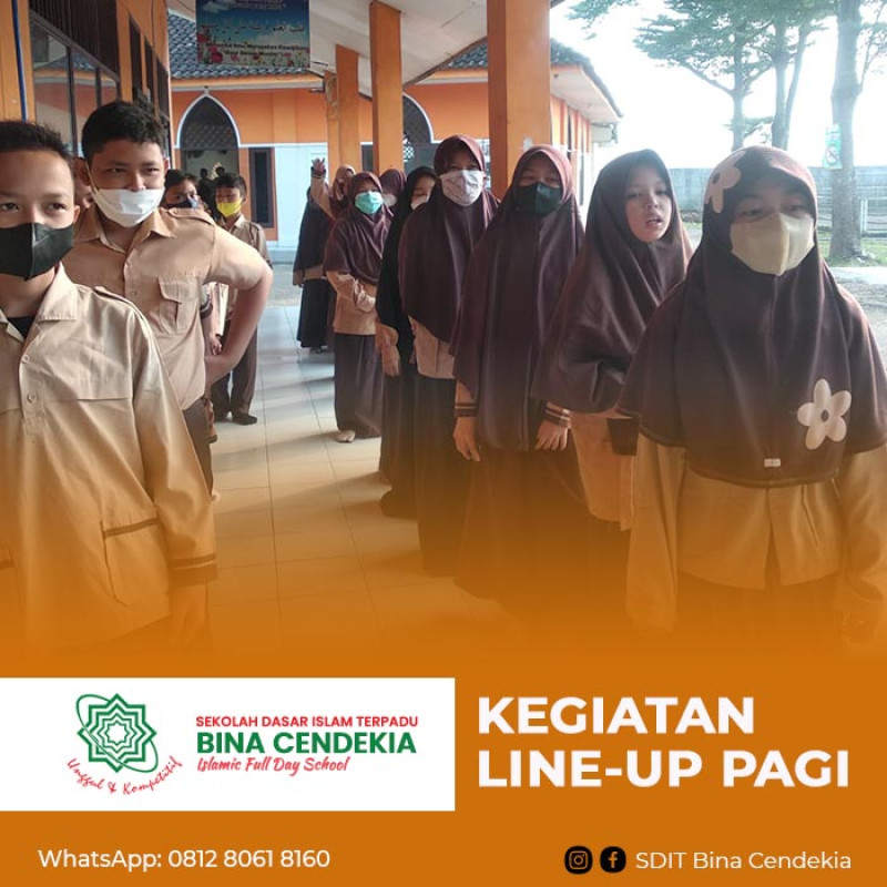 Salah satu pembiasaan pagi siswa- siswi SDIT Bina Cendekia adalah berbaris rapi di depan kelas (line up) sebelum sholat dhuha. Line up ini merupakan salah satu cara membiasakan siswa untuk disipilin dan tertib, serta membangkitkan semangat siswa dalam memulai pembelajaran, membaca ikrar dan do’a, periksa kebersihan pakaian,kuku,rambut, dan mengulang pelajaran.