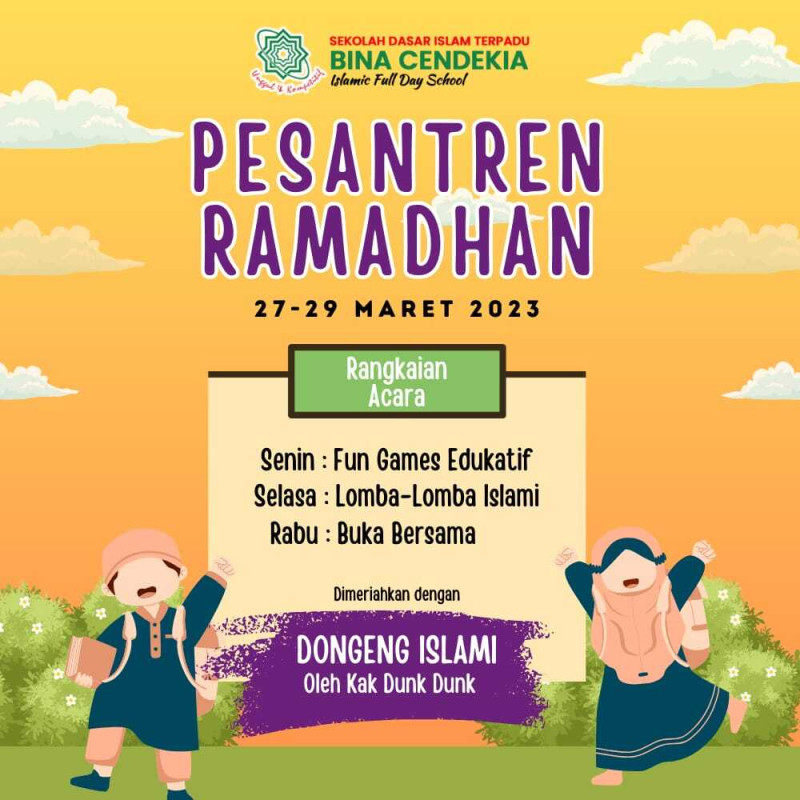Bulan Ramadhan adalah bulan yang ditunggu oleh seluruh kaum muslim dipenjuru dunia. Pesantren Ramadhan merupakan suatu kegiatan yang sangat positif untuk dilakukan dalam rangka membentuk karakter islami pada siswa di sekolah. Pesantren Ramadhan adalah salah satu agenda tahunan SDIT Bina Cendekia Depok. Kegiatan ini di laksanakan selama tiga hari yang dilaksanakan pada hari Senin, 27- 29 Maret 2023.