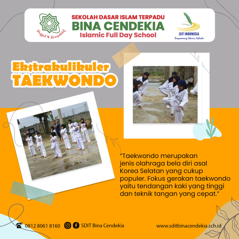 Ekstrakurikuler Taekwondo merupakan salah satu ekstra pilihan yang diselenggarakan di SDIT Bina Cendekia dimana ekstra ini melatih kekuatan, kelincahan dan kecepatan peserta didik. Dengan mengikuti ekstra Taekwondo, siswa mampu memahami seni bela diri yang berasal dari Korea ini, serta mampu meningkatkan kebugaran tubuhnya dengan melakukan olahraga/kegiatan ekstra yang ada di sekolah.