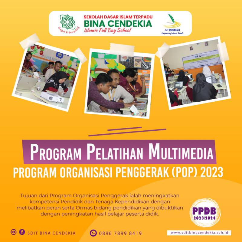 Alhamdulillah kegiatan Program Organisasi Penggerak (POP) Program Multimedia Tahun 2023 ini berjalan dengan sukses dan lancar. Semoga dengan adanya kegiatan ini, semakin meningkatkan pengembangan keprofesian guru khususnya para guru di SDIT Bina Cendekia demi terwujudnya visi, misi dan tujuan sekolah. Aamiin.
