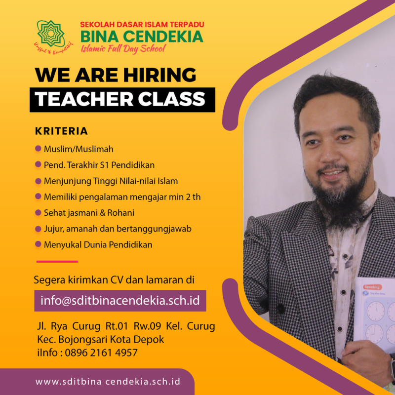 Membuka kesempatan bagi Anda yang berminat menjadi tenaga Pendidik di SDIT BINA CENDEKIA sbb: